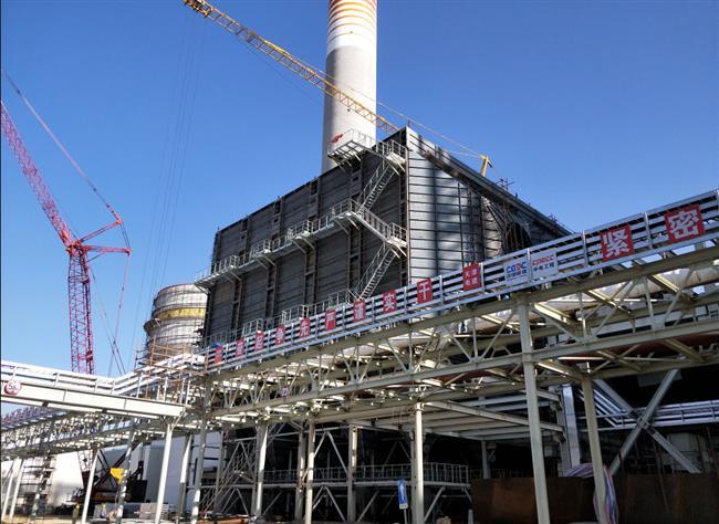 公司发电工程每台炉布置2台干式、卧室、板式三室五电场静电除尘器,分别与脱硫、脱硝装置相连接,除尘效率高达99.9%,能够有效实现对烟尘、粉尘的综合处理。目前#1炉静电除尘器已经完成阴极线、阳极板以及大小框架和顶梁的吊装,施工人员正在电除尘顶部进行高频变压器的安装工作。