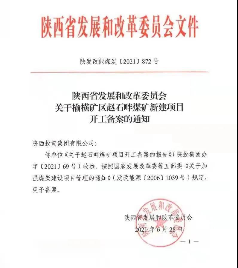 6月28日,公司煤矿项目正式取得了省发改委《关于榆横矿区赵石畔煤矿新建项目开工备案的通知》(陕发改能煤炭〔2021〕872号),标志着煤矿项目建设即将踏上新征程。
