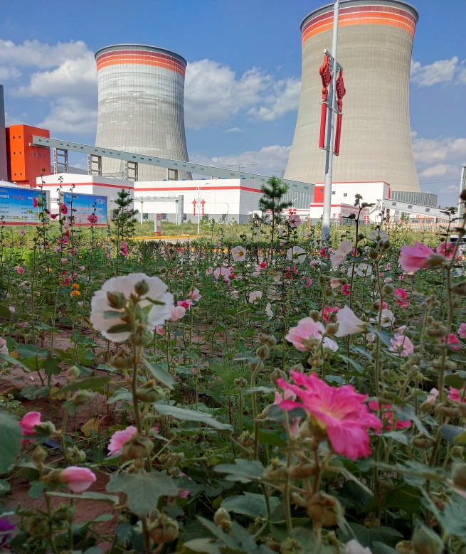 陕北大地这块昔日的山坡丘陵上已矗立起一座现代化火力发电厂,夏日无风的清晨,赵石畔煤电上空的蓝天甚是好看,白色的云团给了它恰到好处的美!眼前莹蓝的天、郁郁葱葱的绿树、争相斗艳的花草又为它的美而增添了几分姿色。
