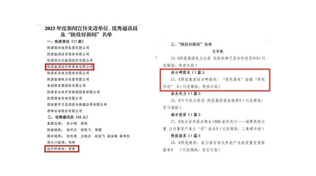 近日,陕投集团党委印发《关于表彰2023年度新闻宣传工作先进单位、优秀通讯员及“陕投好新闻”的通知》,公司荣获2023年度“新闻宣传工作先进单位”称号,职工曹荣获评“优秀通讯员”,《陕投集团赵石畔煤电:“绿色煤电”助推“陕电外送” 》获评“陕投好新闻”。