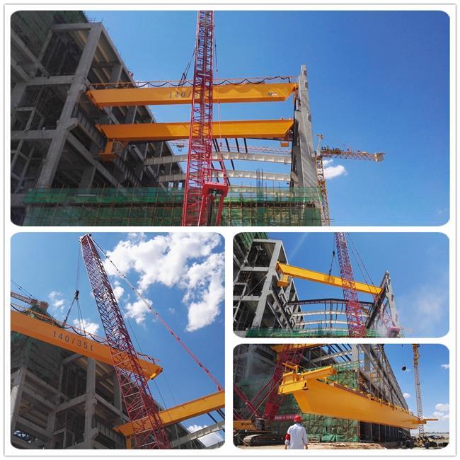 雷龙湾电厂(2×1000MW)工程汽机房行车轨顶标高30.9m,行车跨距34m,行车主梁尺寸为32600mm×1200mm×2500mm,单梁重量39t。设备型号为140/35t,主要用途为汽轮机、发电机及其辅助设备的安装、检修起吊工作。