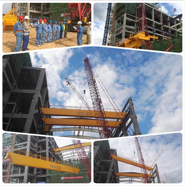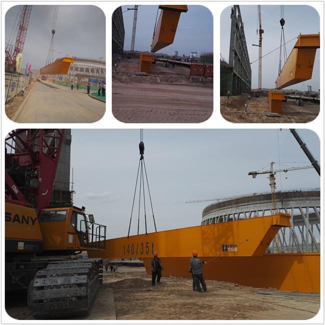 汽机房行车轨顶标高30.9m,行车跨距34m,行车主梁尺寸为32600mm×1200mm×2500mm,单梁重量39t。设备型号为140/35t。其主要用途为汽轮机、发电机及其辅助设备的安装、检修起吊工作。