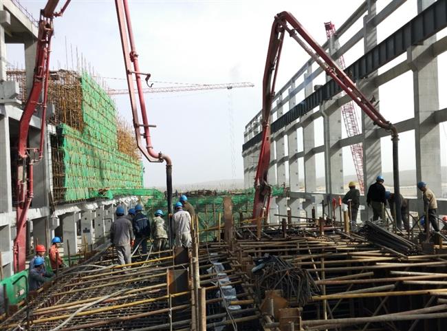 陕北的初春,微风和煦,草木返青,伴随着泵罐车的轰隆声,4月17日上午9时18分,赵石畔公司1号机组汽机基座运转层混凝土开始浇筑。