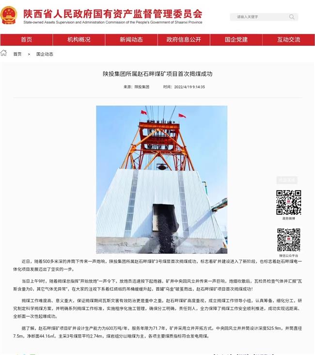 陕西省国资委网站:陕投集团所属赵石畔煤矿项目首次揭煤成功