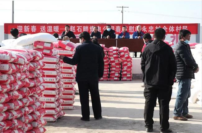 为构建和谐的企地关系,营造良好的外部环境,1月14日下午,公司副总经理师钒耘一行来到横山区雷龙湾镇永忠村,与村镇干部一同为永忠村村民送去了米、面等春节慰问品,并送上了新春祝福,把企业的关怀送到了村民家门口。