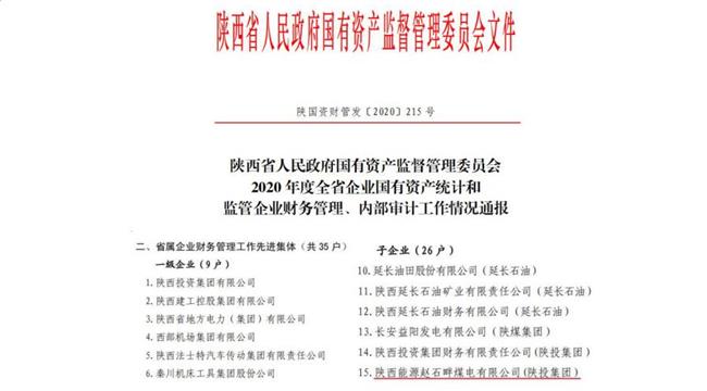 12月14日,陕西省人民政府国有资产监督管理委员会发文通报2020年度全省企业国有资产统计和监管企业财务管理、内部审计工作情况,公司继2019年被授予“省属企业财务管理工作先进集体”后,再次获得此项荣誉。(曹荣)